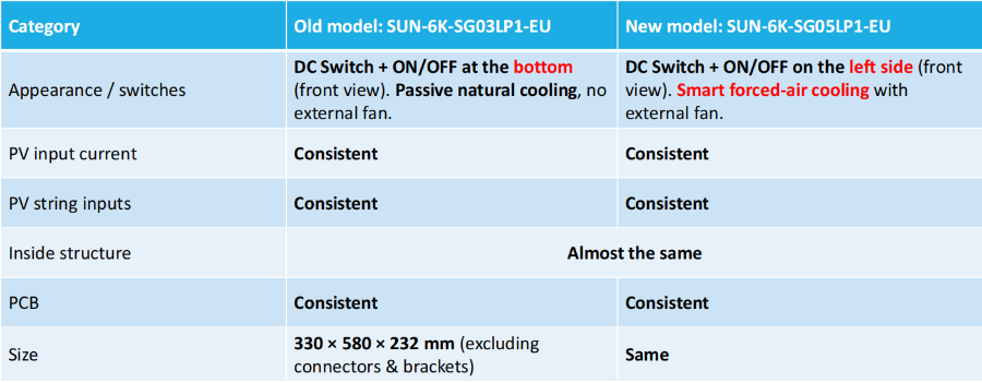 Övergången från den gamla modellen (SUN-6K-SG03LP1-EU) till den nya modellen (SUN-6K-SG05LP1-EU) återspeglar förbättringar av kylning och användargränssnittsdesign, med tillägg av forcerad luftkylning och en mer tillgänglig switchlayout. Dessa förändringar förbättrar både prestanda och användarvänlighet för omriktaren. Installatörer måste dock ta hänsyn till den potentiella bullerpåverkan från den nya externa fläkten och säkerställa korrekt utrymme för effektivt luftflöde. De centrala elektriska komponenterna och dimensionerna förblir i stort sett oförändrade, vilket säkerställer kontinuitet och kompatibilitet i installationer.